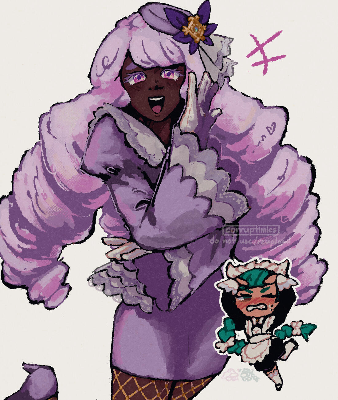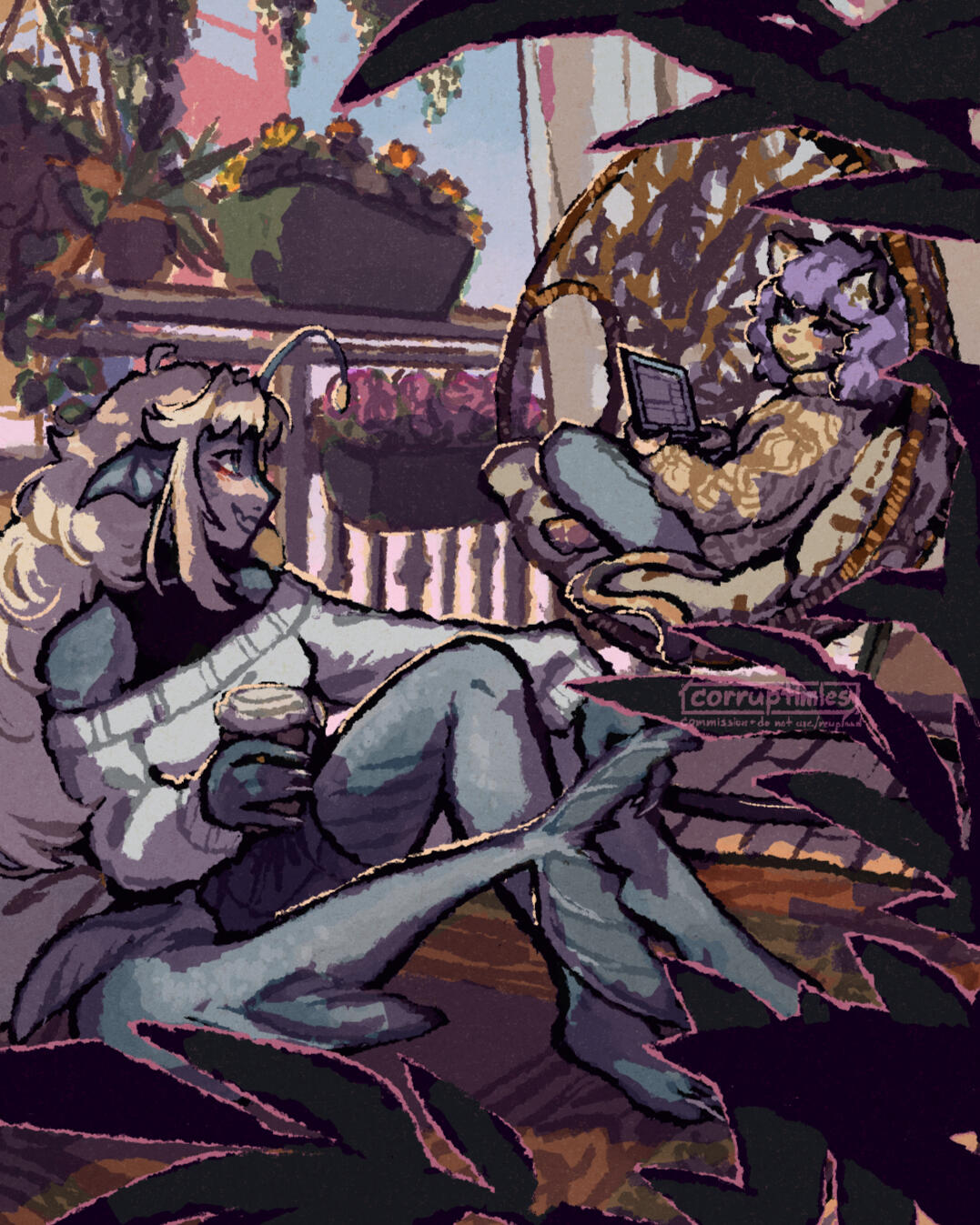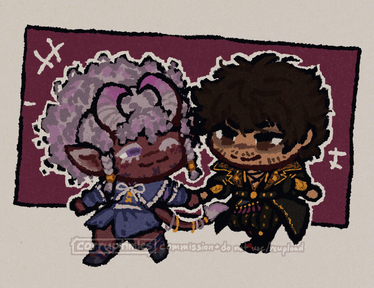 The commissioned Artwork is authorized for your personal use only, such as for the purposes of: social media profile pictures and headers (e.g.cover photos), printings, desktop backgrounds or any other non-profit personal uses. Any other uses of the Artwork require the express and written permission of Corruptimles Artworks.Any and all usage of the Artwork for commercial, business and/or other purposes involving any form of profit or other forms of gain—including but not limited to: branding (e.g. logos), marketing, official mascot(s) and/or any other promotional purposes—is prohibited without the express and written permission of Corruptimles Artworks.Outside of the purposes detailed above and/or given express and written permission by Corruptimles Artworks, usage of the Artwork for any profit or other forms of gain is strictly prohibited. Prohibited uses of the Artwork include but are not limited to: merchandise, Non-Fungible Tokens (NFTs), and/or any and all forms of resale or redistribution for any profit or other forms of gain.CREDIT AND COPYRIGHT:
